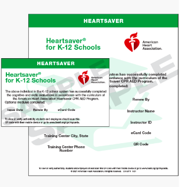 The Heartsaver for K-12 Schools eCard is the digital version of the Heartsaver for K-12 Schools printed course completion card. It is a valid, more secure, and preferred alternative to the printed card. Heartsaver for K-12 Schools eCards should be issued to students and school faculty who successfully complete Heartsaver First Aid CPR AED, Heartsaver CPR AED, or Heartsaver First Aid courses in K-12 schools.